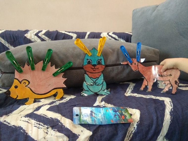 Зайчика я вырезала без ушей, козочку без рожек, морковку без зелени и ёжика без колючек. Ребёнок должен заменить недостающие детали рисунка прищепками.